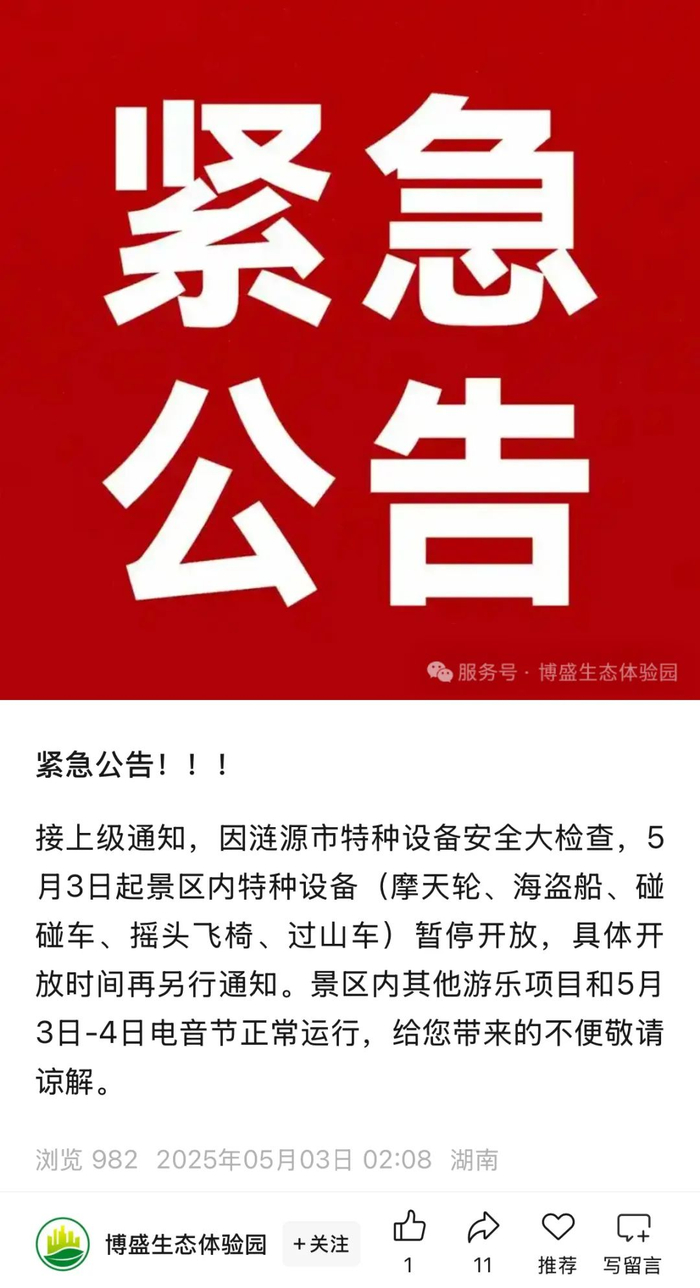 5月3日凌晨,涉事的博盛生态园在公众号发布紧急公告:接上级通知,因涟源市特种设备安全大检查,5月3日起景区内特种设备(摩天轮、海盗船、碰碰车、摇头飞椅、过山车)暂停开放,具体开放时间再另行通知。