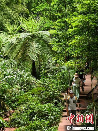 5月3日,四川青神,游客穿行在中岩寺桫椤谷。当日,“五一”假期第3天,四川省眉山市青神县瑞峰镇中岩村中岩寺景区竹林间石板步游道上人来人往,来自四面八方的游客沉浸自然山水,沉醉生态美景,乐享假日休闲时光。中新社记者 刘忠俊 摄