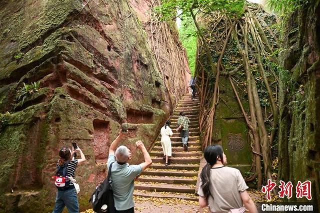 5月3日,四川青神,中岩寺石壁上的树根吸引游客拍照。当日,“五一”假期第3天,四川省眉山市青神县瑞峰镇中岩村中岩寺景区竹林间石板步游道上人来人往,来自四面八方的游客沉浸自然山水,沉醉生态美景,乐享假日休闲时光。中新社记者 刘忠俊 摄