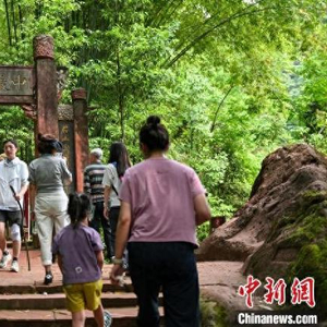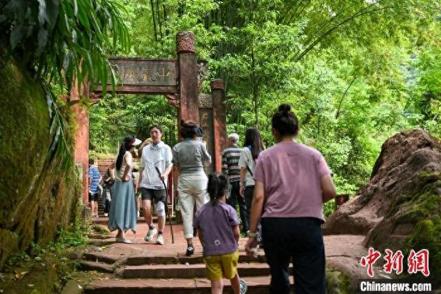 5月3日,四川青神,中岩寺内爬山的游客。当日,“五一”假期第3天,四川省眉山市青神县瑞峰镇中岩村中岩寺景区竹林间石板步游道上人来人往,来自四面八方的游客沉浸自然山水,沉醉生态美景,乐享假日休闲时光。中新社记者 刘忠俊 摄