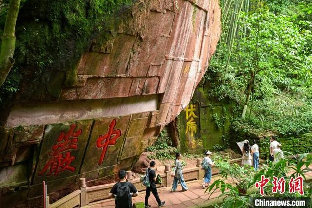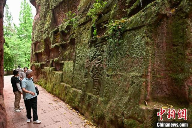 5月3日,四川青神,中岩寺之巅的石刻。当日,“五一”假期第3天,四川省眉山市青神县瑞峰镇中岩村中岩寺景区竹林间石板步游道上人来人往,来自四面八方的游客沉浸自然山水,沉醉生态美景,乐享假日休闲时光。中新社记者 刘忠俊 摄