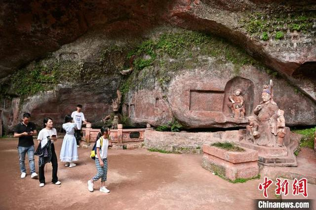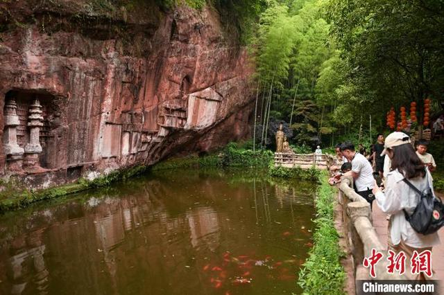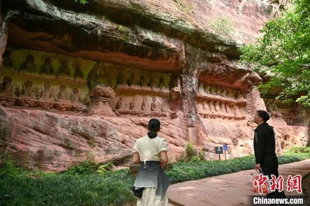 5月3日,四川青神,中岩寺千佛长廊摩崖石刻吸引游客驻足。当日,“五一”假期第3天,四川省眉山市青神县瑞峰镇中岩村中岩寺景区竹林间石板步游道上人来人往,来自四面八方的游客沉浸自然山水,沉醉生态美景,乐享假日休闲时光。中新社记者 刘忠俊 摄