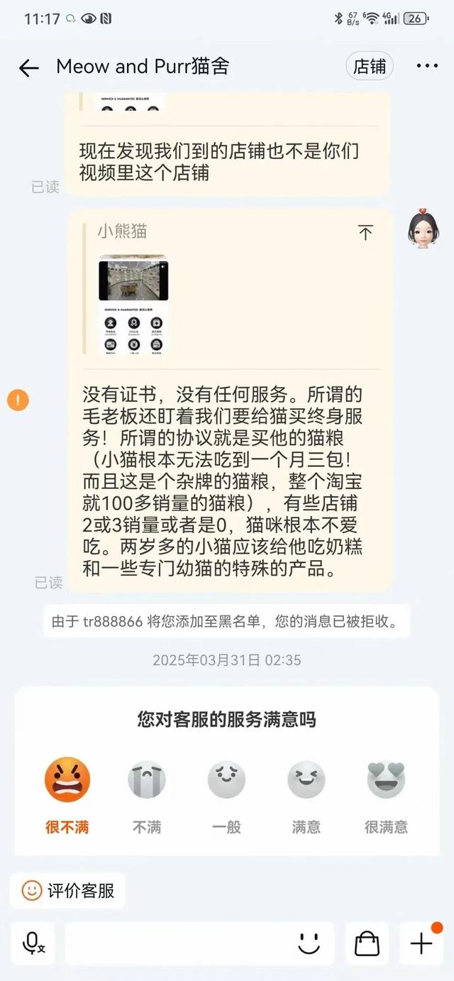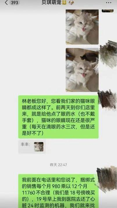 韩先生向宠物店讨要说法,对方不承认售卖病猫,并拒绝退费。随后,他被微信上约他们去店里选购宠物的人拉黑了。