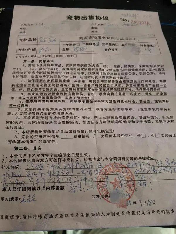 其次,签订书面合同很关键,合同要明确宠物品种、血统、性别、月龄、疫苗接种记录、健康状况等。尤其对于宠物在短期内出现传染病或死亡等情况,双方应对责任界定及解决方案作出明确约定。如果存在不公平、不合理的条款,要求经营者修改。对于商家的口头约定或承诺,一定要以文字形式写入合同条款,以便日后发生纠纷时有据可依。