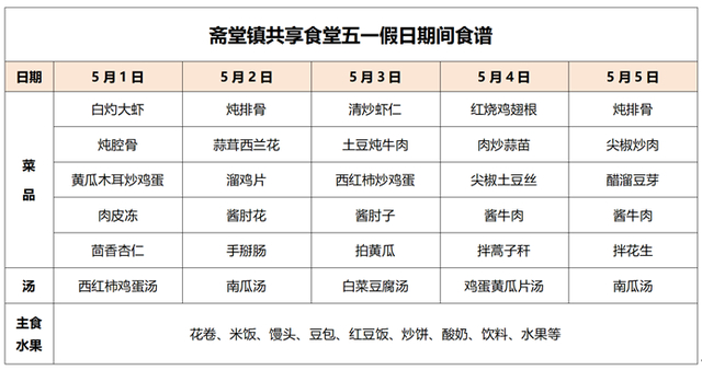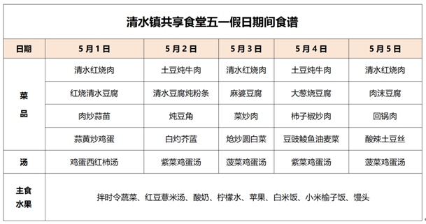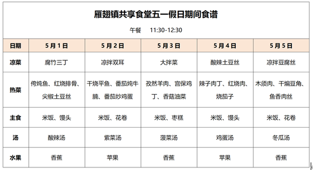 共享餐厅服务时间:5月1日-5月5日,11:30-13:00