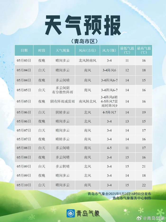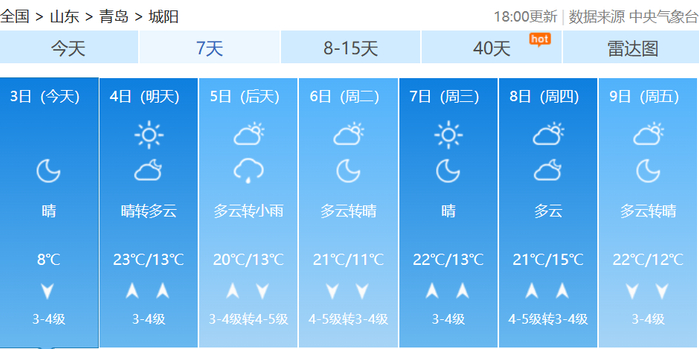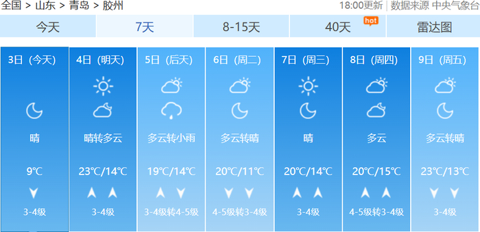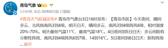 【青岛市区】4日白天,晴间多云,南风3到4级阵风6级,相对湿度20%~70%。4日最低气温11℃,最高气温18℃。