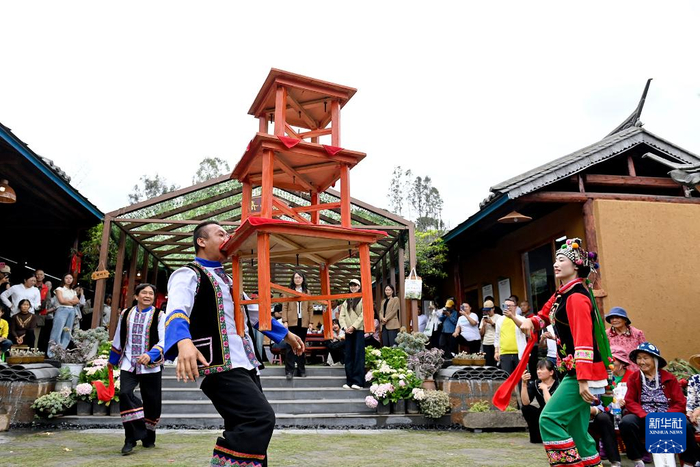5月2日,在云南省大理南涧彝族自治县南涧镇西山跳菜村,跳菜队员在展示国家级非物质文化遗产代表性项目南涧彝族跳菜。