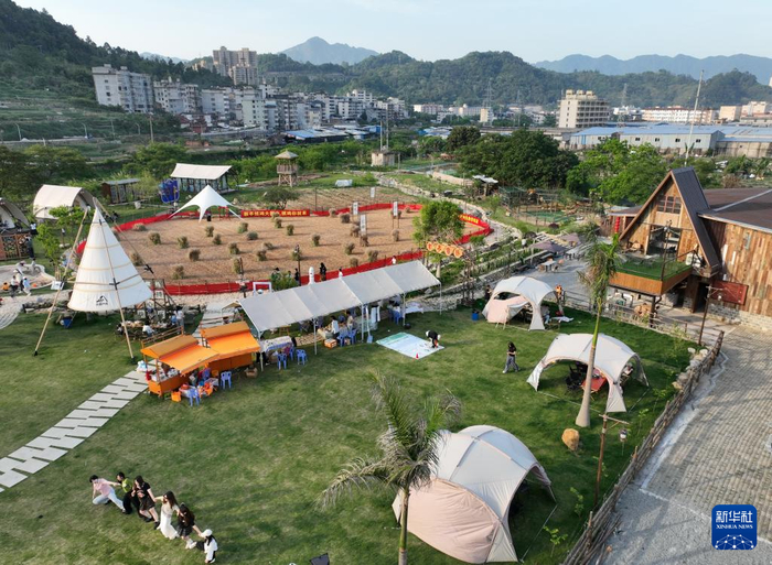 5月2日,游客在福建省罗源县凤山镇一家利用古厝和废弃垃圾场建成的“新亭驿站”体验园中游览(无人机照片)。