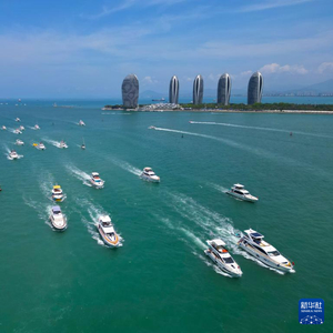 5月3日,大批游艇在海南省三亚湾凤凰岛附近的海面上。