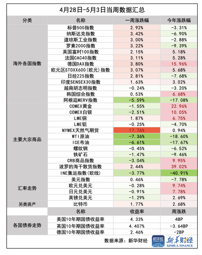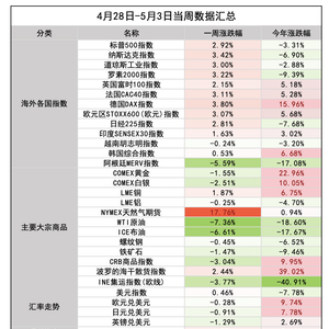 新华财经上海5月4日电(葛佳明) 本周(4月28日-5月4日)美国非农就业数据超预期强劲,市场避险情绪缓解,美联储降息预期有所降温,美股三大股指集体上涨,美元指数本周录得连续第二周收涨,收于100整数关口附近,黄金则录得连续第二周下跌,油价则因石油输出国组织等产油国(以下简称“欧佩克+”)不愿进一步减产消息影响重挫。