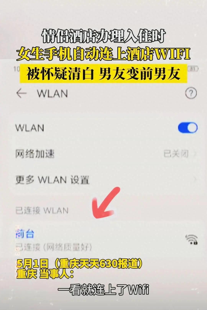 近日,重庆。一对情侣酒店办理入住时,女生手机自动连上酒店WIFI,被男友怀疑清白,两人分手。#女生手机自动连上酒店WIFI被分手#冲上热搜第一,引发热议。
