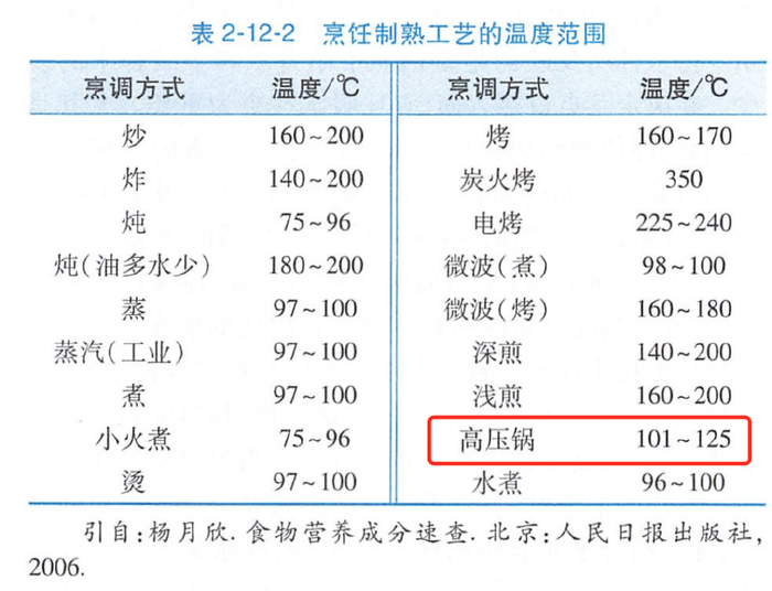 电压力锅(属于高压锅)的烹调温度在 101~125℃,相比于炒炸烤煎等烹调方式,温度并不算高,对营养的破坏小。[4]
