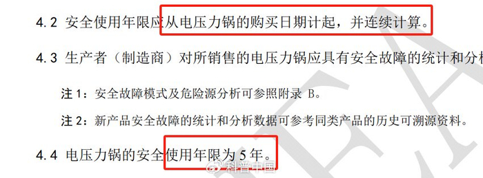 每个电器都有使用寿命,电压力锅也不例外。因为老化会增加安全隐患,更需要注意。中国家用电器协会去年发布的标准要求,从购买日开始算,电压力锅的使用年限不超过 5 年。这还需要注意使用条件,每次使用不超过 1 小时,每年不超过 500 次。如果高频使用,年限可能还要缩短。[6]