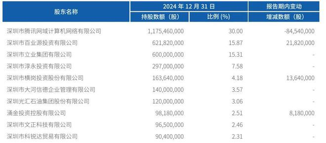 截至2024年12月31日,腾讯持股为30%,深圳市百业源投资有限公司持股为15.87%,深圳市立业集团有限公司分别持股为15.31%,深圳市淳永投资有限公司持股为7.58%,深圳市横岗投资股份有限公司持股为4.18%,深圳市大河信德企业管理有限公司持股为3.57%,深圳光汇石油集团股份有限公司持股为3.06%;