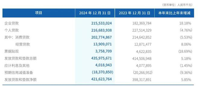 微众银行2024年末发放贷款和垫款总额为4,359.76 亿元,比上年末增加214.69 亿元,增长5.18%。其中,企业贷款比上年末增加331.63亿元,增长18.18%,主要为小微企业贷款增加所致;个人贷款为2167亿元,较上年同期的2275亿元下降4.76%。