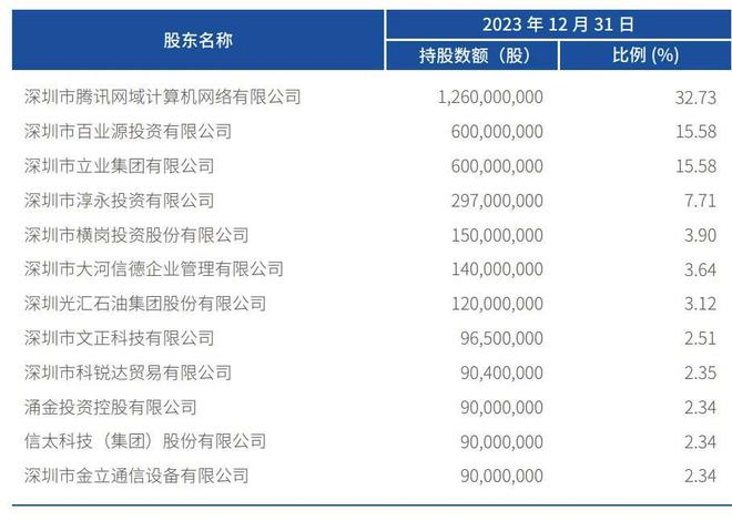 截至2023年12月31日,腾讯持股为32.73%,深圳市百业源投资有限公司、深圳市立业集团有限公司分别持股为15.58%,深圳市淳永投资有限公司持股为7.71%,深圳市横岗投资股份有限公司持股为3.9%,深圳市大河信德企业管理有限公司持股为3.64%,深圳光汇石油集团股份有限公司持股为3.12%;