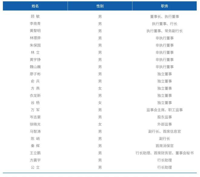 微众银行执行董事、董事长为顾敏,执行董事、行长为李南青,执行董事、常务副行长为黄黎明;