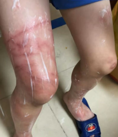 随后,该男孩双腿出现大面积红肿,部分皮肤溃烂到可以看到脂肪组织,还先后进行了两次植皮手术。