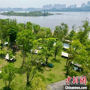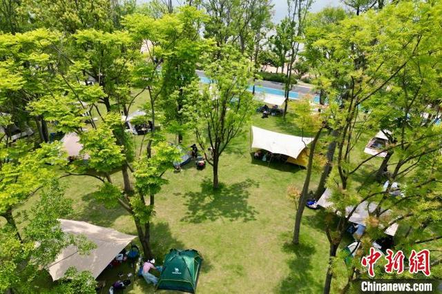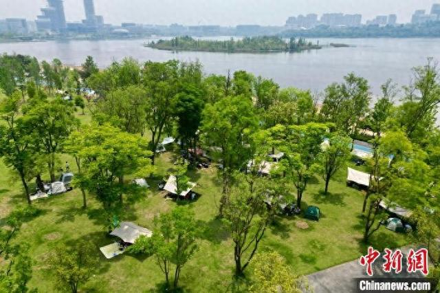 5月4日,四川成都兴隆湖人气旺,民众携带户外装备在湖畔安营扎寨,乐享“五一”露营生活。中新社记者 张浪 摄