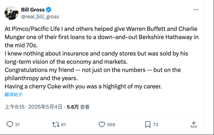 “我对保险和糖果店一无所知,但他对经济和市场的长远眼光让我心动不已。祝贺你,我的朋友。不仅仅是业绩,还有你的慈善事业和多年的付出。和你一起喝樱桃味可乐是我职业生涯的一大亮点。” Gross说。