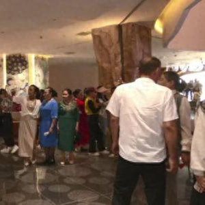 游客在天山托木尔景区游客服务中心观看演出。