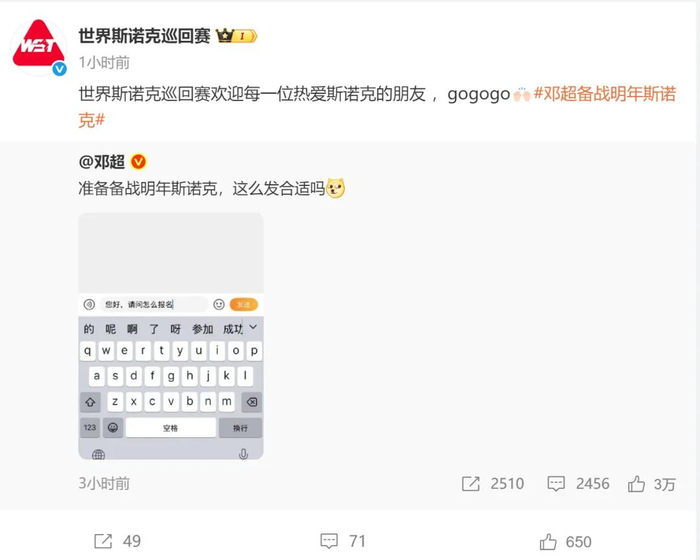 世界斯诺克巡回赛随后发文回复邓超:“欢迎每一位热爱斯诺克的朋友,gogogo。”