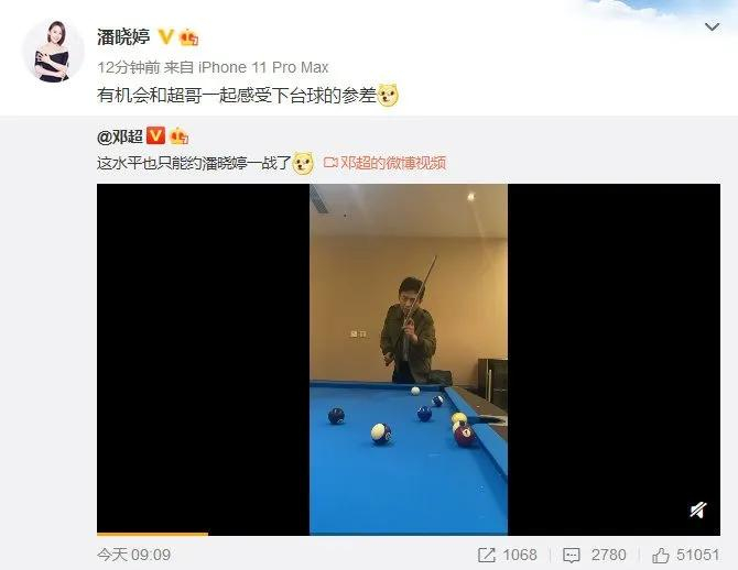 随后,潘晓婷转发并回复:“有机会和超哥一起感受下台球的参差。”