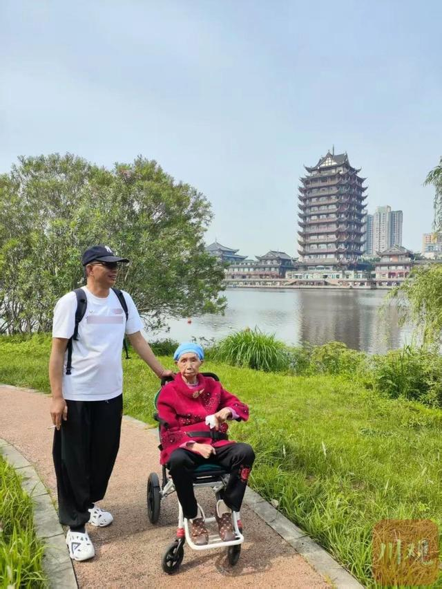 “这条花背袋是我儿子外婆亲手做的,母亲用它背过孙子孙女儿。如今,当母亲走不动了,我用来背着她去旅行。”其实,背带并不是柴万斌带母亲出行的首选辅助交通工具,他们还准备有轮椅。“只有不好走的地方,才用得上背带。”柴万斌说,他用背带背着母亲还看过西昌的邛海、眉山的水街、东坡岛等风景,有时是抱着母亲,只有这一次被人拍了,还发了抖音和视频号,让他走红网络。