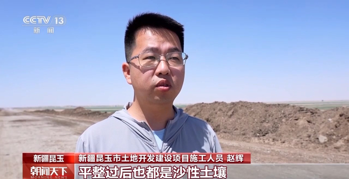 新疆昆玉市土地开发建设项目施工员 赵辉:这边原本都是沙漠原始地貌,平整过后也都是沙性土壤,沙土的营养贫瘠,肥力差,抓一把土,能从指缝里漏掉90%。通过羊粪和水溶肥的有效结合,施进去之后,我们能把沙土的结构团粒化,简单来说就是把一团散沙变成紧密有孔隙的小团体,这样施进去的水和营养都能留存住。