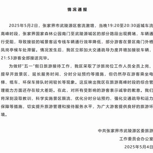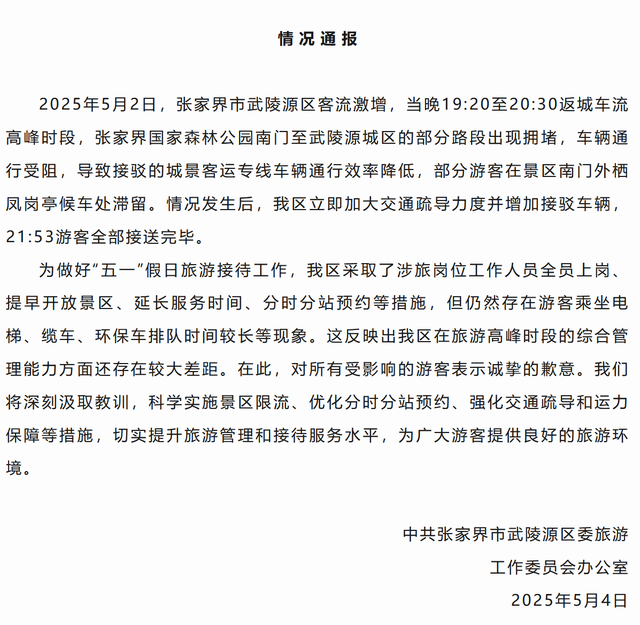 2025年5月2日,湖南张家界市武陵源区客流激增,当晚19:20至20:30返城车流高峰时段,张家界国家森林公园南门至武陵源城区的部分路段出现拥堵,车辆通行受阻,导致接驳的城景客运专线车辆通行效率降低,部分游客在景区南门外栖凤岗亭候车处滞留。情况发生后,我区立即加大交通疏导力度并增加接驳车辆,21:53游客全部接送完毕。