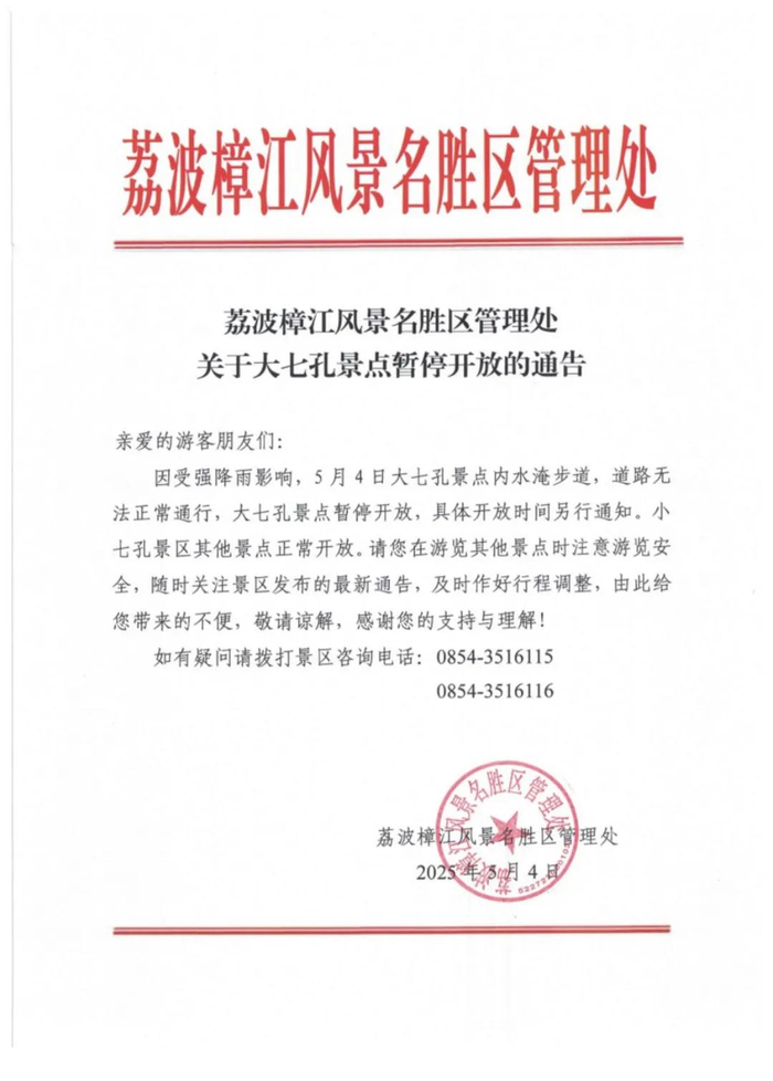 因受强降雨影响,5月4日大七孔景点内水淹步道,道路无法正常通行,大七孔景点暂停开放,具体开放时间另行通知。小七孔景区其他景点正常开放。请您在游览其他景点时注意游览安全,随时关注景区发布的最新通告,及时做好行程调整,由此给您带来的不便,敬请谅解,感谢您的支持与理解!