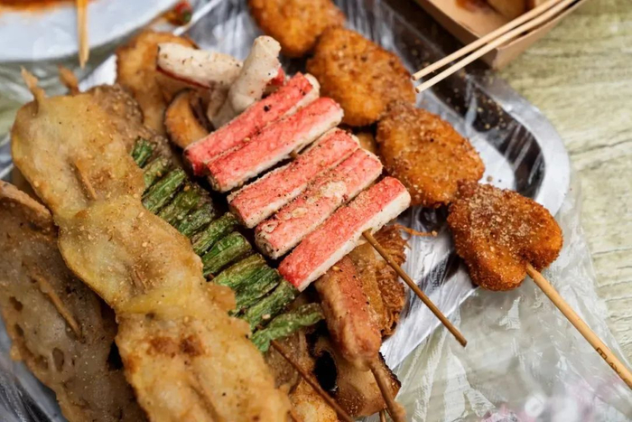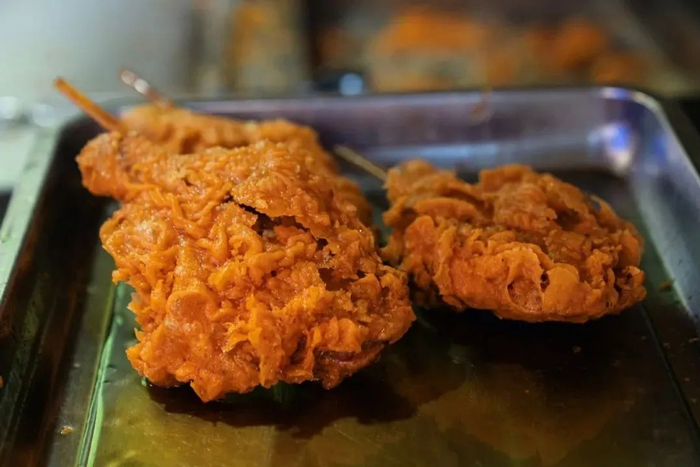各色串串裹着面糊下油锅一炸