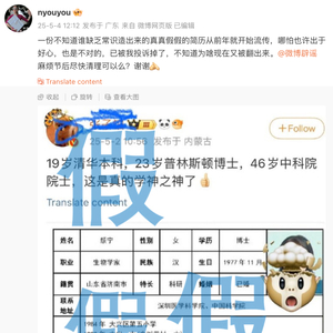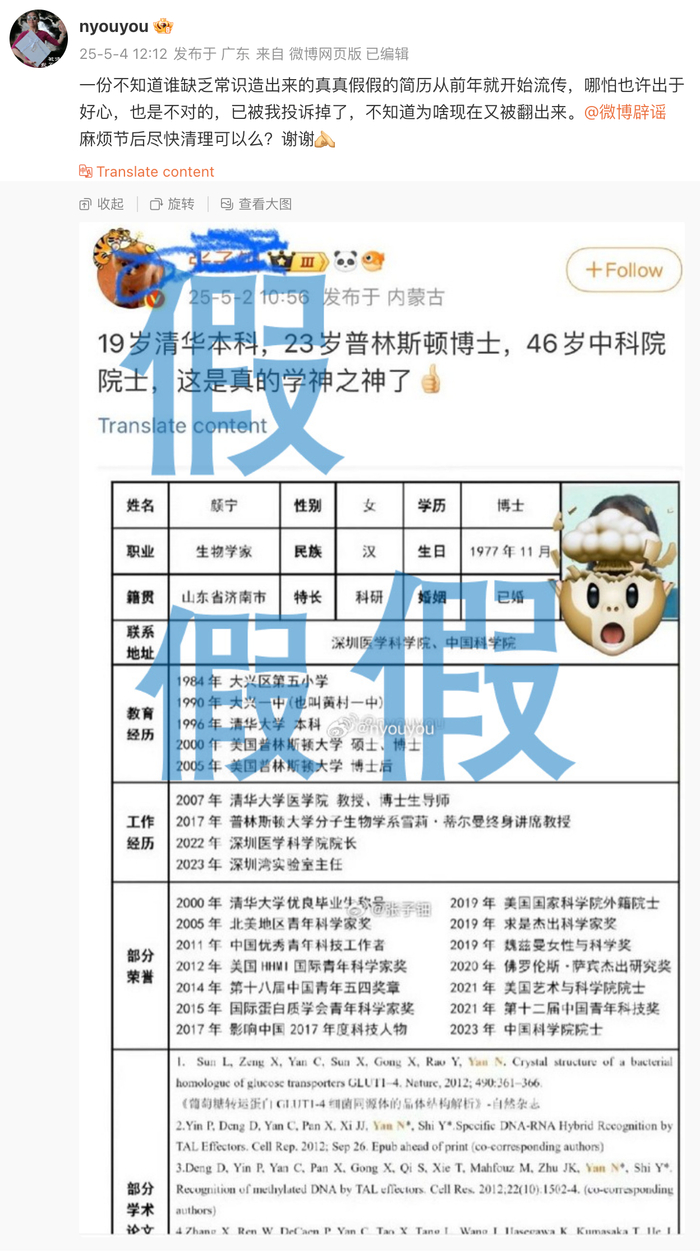 5月4日,中国科学院院士、深圳医学科学院院长、深圳湾实验室主任颜宁通过其个人微博发文打假网传简历,并请微博节后尽快清理相关信息。她表示:“一份不知道谁缺乏常识造出来的真真假假的简历从前年就开始流传,哪怕也许出于好心,也是不对的,已被我投诉掉了,不知道为啥现在又被翻出来。”