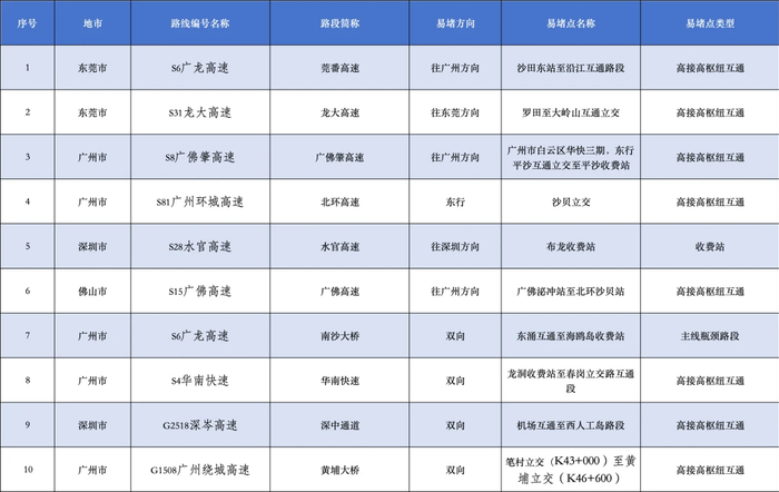 1.繁忙高速公路路段(含收费站、高接高枢纽互通),共10处