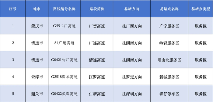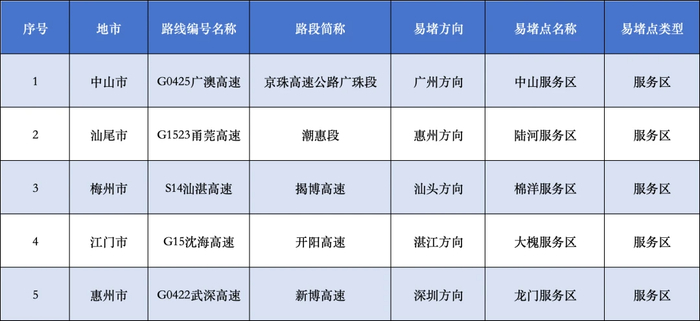 广东省交通管理厅经与省交通运输厅联合研判,今年广东省“五一”期间较为拥堵的路段、车流繁忙服务区、充电繁忙服务区有以下几处:
