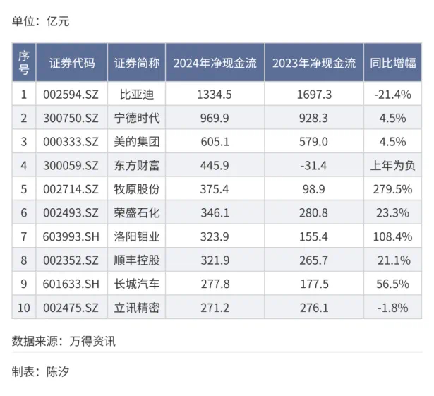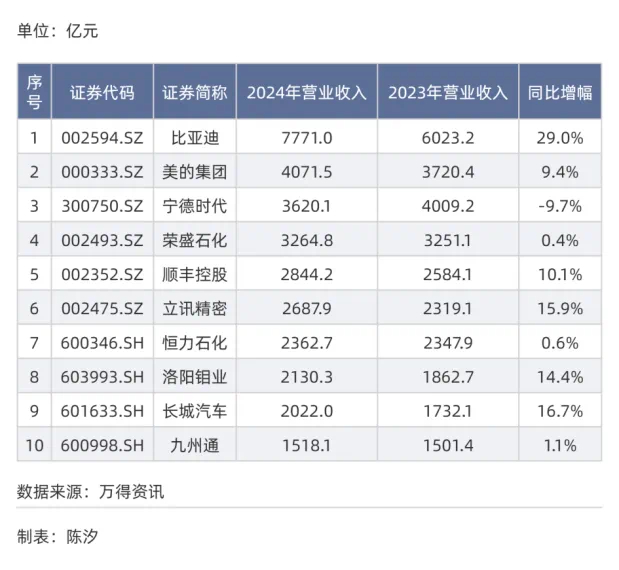 与净利润表(表2)对照,比亚迪、宁德时代、美的集团仍居前三。第五名牧原股份在表2中是第四,第七名洛阳钼业在表2中是第五,第八名顺丰控股在表2中是第十,第九名长城汽车在表2中是第七,第十名立讯精密在表2中是第六。