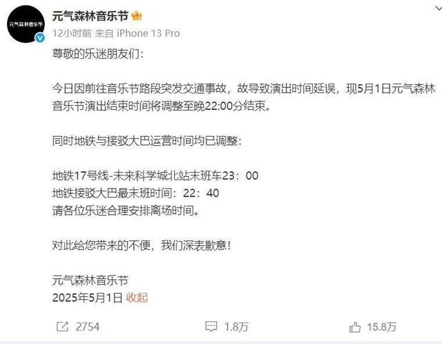 5月1日晚,@元气森林音乐节 发布致歉声明,称“今日因前往音乐节路段突发交通事故,故导致演出时间延误,现5月1日元气森林音乐节演出结束时间将调整至晚22:00分结束。同时地铁与接驳大巴运营时间均已调整。”