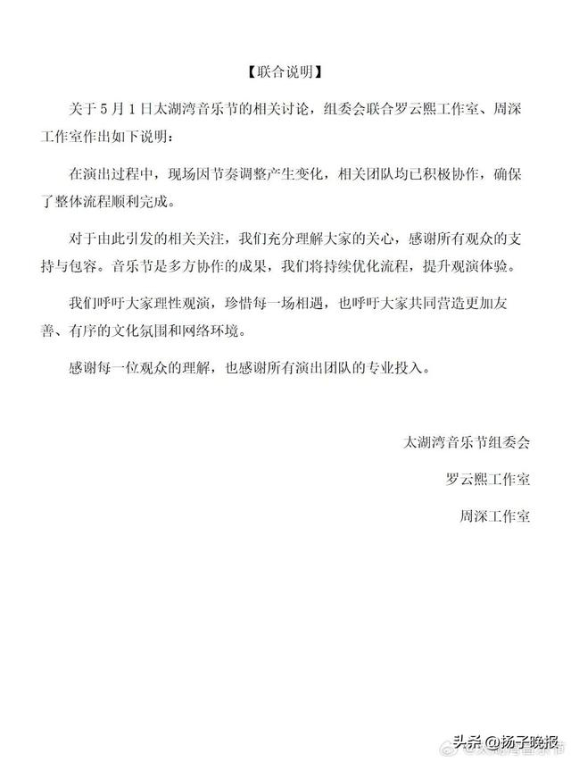 关于5月1日太湖湾音乐节的相关讨论,组委会联合罗云熙工作室、周深工作室作出如下说明: