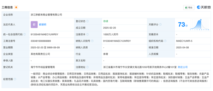天眼查显示,浙江胖都来商业管理有限公司成立于今年2月20日,位于浙江省嘉兴市,注册资本达1000万元,经营范围包括:商业综合体管理服务、日用百货销售、服装服饰批发、农副产品销售等。公司法定代表人为都建明。