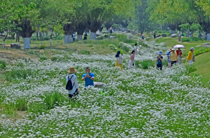 5月4日,市民游客在汉长安城未央宫国家考古遗址公园内的雏菊和金鸡菊花海中打卡,这片花海位于公园内的未央宫前殿遗址西侧。雏菊和金鸡菊各有特色,吸引市民游客纷纷拍照留影,享受美好的假日时光。(记者 谢伟)详情:美好假期 打卡花海