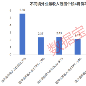 举例来看,移为通信2022年至2024年境外业务收入占比持续超过85%,今年4月份跌幅超过15%。赢合科技2022年至2024年境外业务收入占比位于40%至50%之间,今年4月份跌幅也超过15%。有友食品4月份以来股价涨幅超过25%,公司业务集中在国内。