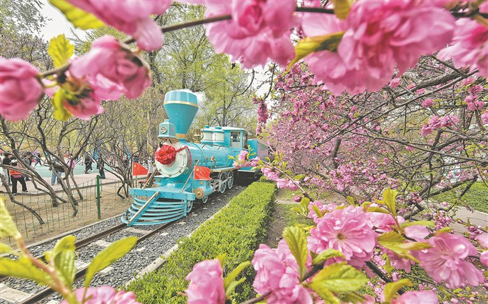 4日,哈尔滨儿童公园观光小火车载着市民和游客穿越花海,畅享春光。