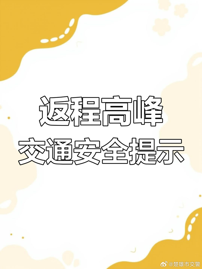 楚雄市公安交管部门、辖区派出所加大各类交通违法行为的查处整治和出行群众的交通安全劝导提示。交警提示:注意关注天气,请谨慎驾驶。广大驾驶人出行前可通过导航、广播、微博等方式关注沿途路况,合理规划线路,错时错峰返程,注意避开易拥堵路段。尽量减少夜间驾驶,切莫疲劳驾驶,酒后驾驶,超员超载,驾乘车辆请系好安全带,骑乘摩托车、电动车请佩戴安全头盔。
