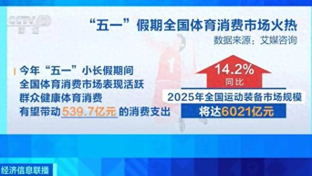 数据显示,今年“五一”小长假期间全国体育消费市场表现活跃,群众健康体育消费有望带动539.7亿元的消费支出,2025年全国运动装备市场规模将达6021亿元,同比增长14.2%。