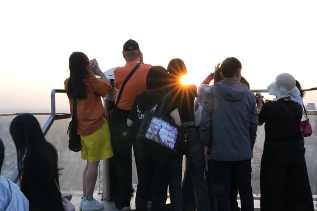 视线往西看去,夕阳的余晖将整片天空染成橙红色,云层如同被点燃一般绚烂。高楼大厦的轮廓逐渐模糊,取而代之的是一层温暖的金色光晕,整座城市仿佛被镀上一层金边,市民游客纷纷用手摆出爱心、yes形状,只为将如咸蛋黄般的太阳框在掌心。