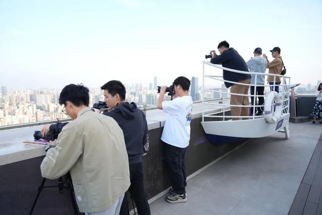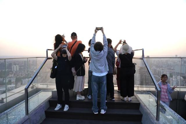 摄影爱好者陈先生支起三脚架,镜头对准城市街景:“这个角度能拍到‘三件套’与高楼大厦同框,是街景拍摄中独特的视角。”从苏州来上海旅游的市民居先生则笑着说:“在互联网平台刷到过好几次环球港顶楼开放的信息了,假期里特地赶来,亲眼看上去,层层叠叠的高楼大厦还是非常震撼的,上海果然是有‘魔都’的气质。”