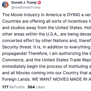 特朗普说,他将授权美国商务部和美国贸易代表立即启动程序,对所有进入美国、在外国制作的电影征收100%关税,希望“再次拥有美国制作的电影”。