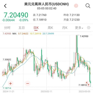 5月5日,离岸人民币盘中一度升穿7.20关口,为去年11月以来首次,创近半年以来新高。