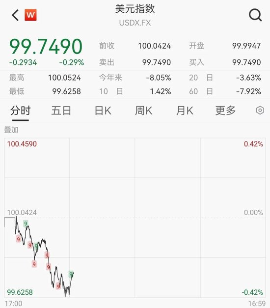 5月5日,美元指数快速跳水,并再度跌破100大关,最低下探至99.6258。截至发稿,报99.749。