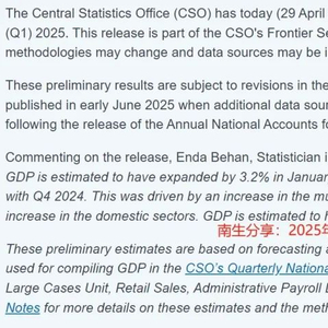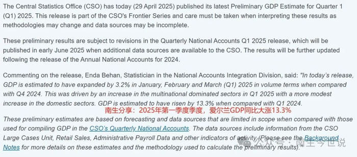 环比增长3.2%,虽略低于前一季度的3.6%,但爱尔兰2025年第一季度的经济同比增长率却扩大至13.3%,为2021年第四季度以来的最高水平——主要是由跨国集团主导的行业增长推动的,内资经济仅略有增长。